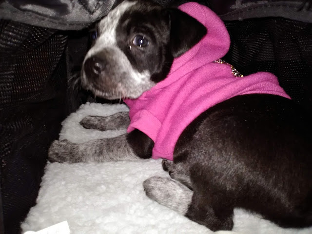 I filled up and went inside to use the bathroom, and when I came back out, I heard some whining. I look down, and in a Tecate box is this cute little puppy. I looked around the entire parking lot to first make sure there were no other puppies out in this cold and secondly to see if anyone would claim them or saw something. Most people said no and got in their cars or acted disinterested. So I did the only thing I could think of, I put her in my car and brought her with me.