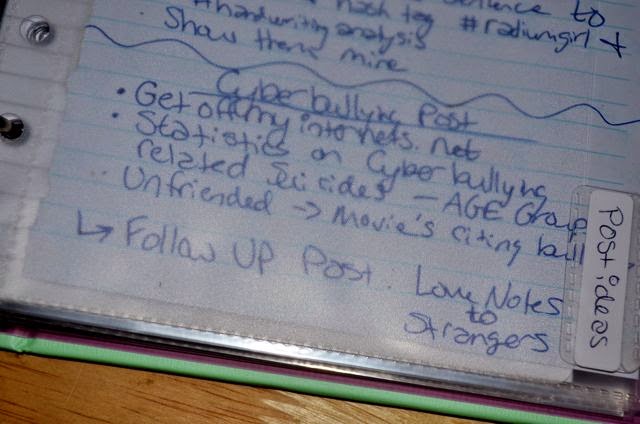 | So I’ve got some post ideas… this is one of the notebook pages, torn out & placed in a pocket protector. No wasted paper! |