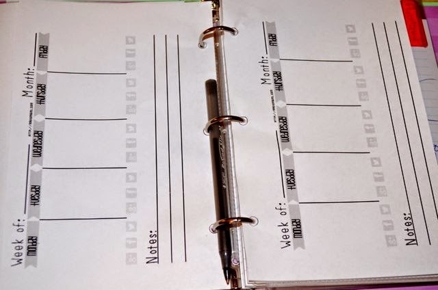- Print a weekly calendar with tasks on it that takes up half the page, make sure it is on the same sheet twice, print, cut in half and insert between notes.
