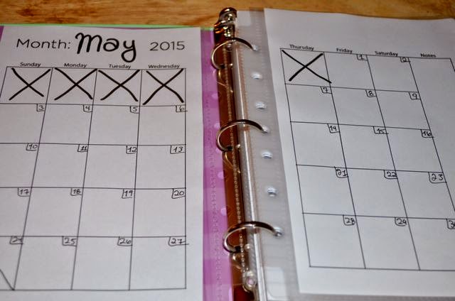 - Print a blank monthly calendar, cut it in half, hole-punch and insert facing up.